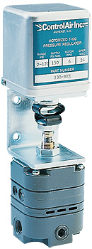 T100M Motorized Precision Air Pressure Regulator Precise pneumatic control by use of an electrical signal The ControlAir Type-100M Motorized Air Pressure Regulator is designed to provide precise pneumatic control by use of an electrical signal. This highly accurate device is well suited for pneumatic control of a system from a remote location. Utilizing two tandem synchronous AC Motors, each having it's own set of leads, but operating through a single output shaft, direction of rotation is dependant of which set of leads power is applied to. The motor is coupled to ControlAir's Type-100, which is a high precision, multi-stage air pressure regulator with low power requirements. OPERATION: When no electrical power is supplied the regulator maintains a precise set point despite variable supply pressure conditions and flow rates. When power is applied to the motor the regulator pressure output changes intermittently.